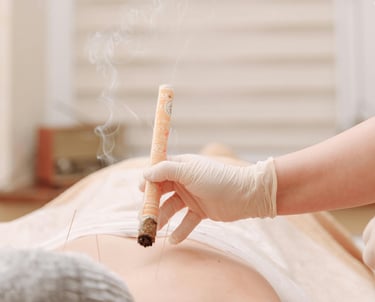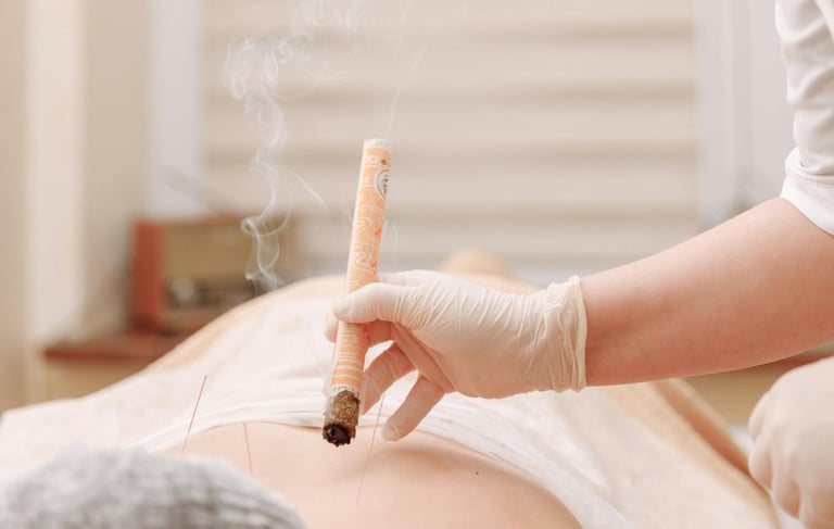 Moxabustão utiliza o calor suave da erva artemísia para aquecer e tonificar o corpo em casos de fadiga ou baixa energia.